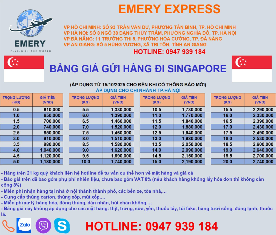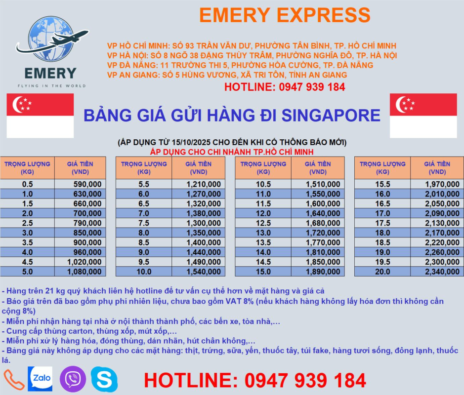 GỬI HÀNG SANG SINGAPORE THÁNG 10/2025 TẠI EMERY EXPRESS
