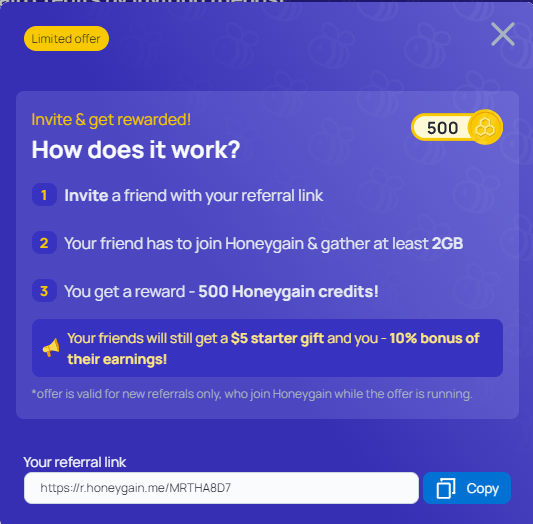 Nếu bạn đang tìm kiếm một cách để kiếm thêm thu nhập trực tuyến, thì Honeygain chính là lựa chọn tuyệt vời cho bạn. Bạn có thể kiếm tiền mà không cần phải bỏ ra bất kỳ chi phí nào. Chỉ cần tải xuống ứng dụng và chia sẻ băng thông của mình, Honeygain sẽ trả cho bạn tiền mỗi ngày. Ngoài ra, Honeygain còn cung cấp chương trình liên kết hấp dẫn cho những người muốn giới thiệu ứng dụng này đến với bạn bè và người thân. Khi bạn giới thiệu Honeygain cho người khác, bạn sẽ nhận được khoản thưởng 10% của thu nhập hàng ngày của người mà bạn giới thiệu. Điều đó có nghĩa là, nếu bạn giới thiệu cho ai đó và họ kiếm được 20 USD mỗi tháng, bạn sẽ nhận được 2 USD mỗi tháng từ khoản thưởng liên kết. Ngoài khoản thưởng liên kết, Honeygain còn cung cấp cho người dùng một khoản tín dụng trị giá 5 USD khi đăng ký tài khoản mới. Điều này có nghĩa là, nếu bạn giới thiệu cho người khác và họ đăng ký tài khoản mới bằng mã giới thiệu của bạn, họ sẽ nhận được khoản tín dụng này để bắt đầu sử dụng Honeygain. Honeygain là một ứng dụng đơn giản và dễ sử dụng. Nếu bạn muốn kiếm tiền mà không cần làm bất kỳ công việc nào khác, hãy thử sử dụng Honeygain ngay hôm nay. Bạn có thể tải xuống ứng dụng và đăng ký tài khoản tại đây : https://r.honeygain.me/MRTHA8D7