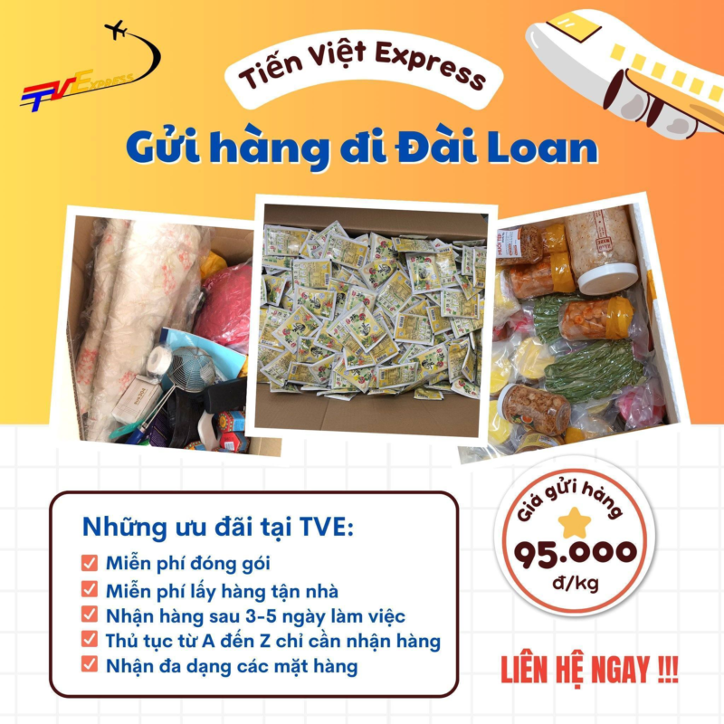 GỬI HÀNG ĐI ĐÀI LOAN – GIÁ CHỈ TỪ 95.000 VND/KG VẬN CHUYỂN QUỐC TẾ TIẾN VIỆT ✈ Dịch vụ vận chuyển quốc tế chuyên nghiệp với giá siêu tốt mọi thời điểm ! Hỗ trợ tối đa cho khách hàng 👉 Nhận vận chuyển đa dạng mặt hàng – quần áo, thực phẩm, mỹ phẩm, kể cả hàng khó 🎯 Thời gian vận chuyển nhanh chỉ từ 4-6 ngày là nhận hàng tận nhà 🎯 Tư vấn miễn phí 24/7, miễn phí nhãn mác, bao bì, đóng thùng chuẩn hãng bay 🎯 Hệ thống chi nhánh rộng khắp, phục vụ bạn ở bất cứ đâu 🎯 An tâm với dịch vụ chuyên nghiệp: Hỗ trợ thủ tục hải quan và tư vấn lựa chọn đúng để hàng được đến nơi an toàn và trọn vẹn 🌍 Tại sao bạn không tận dụng cơ hội này để gửi hàng kinh doanh, tiêu dùng hoặc chăm sóc người thân và bạn bè đang ở nước ngoài! 🔺 Đừng chần chừ! Liên hệ ngay với chúng tôi để tìm hiểu thêm về giá cả và cách thức gửi hàng. Hãy lựa chọn sự tiết kiệm và tin cậy với Tiến Việt Express.