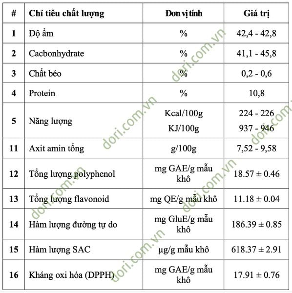 Bảng chỉ tiêu chất lượng tỏi đen Lý Sơn Dori