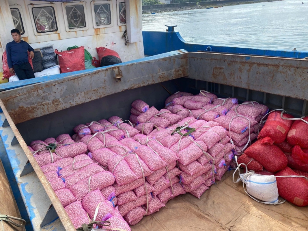 Những bao tỏi tươi xếp lên tàu chuẩn bị vận chuyển vào đất liền. Ảnh: NVCC