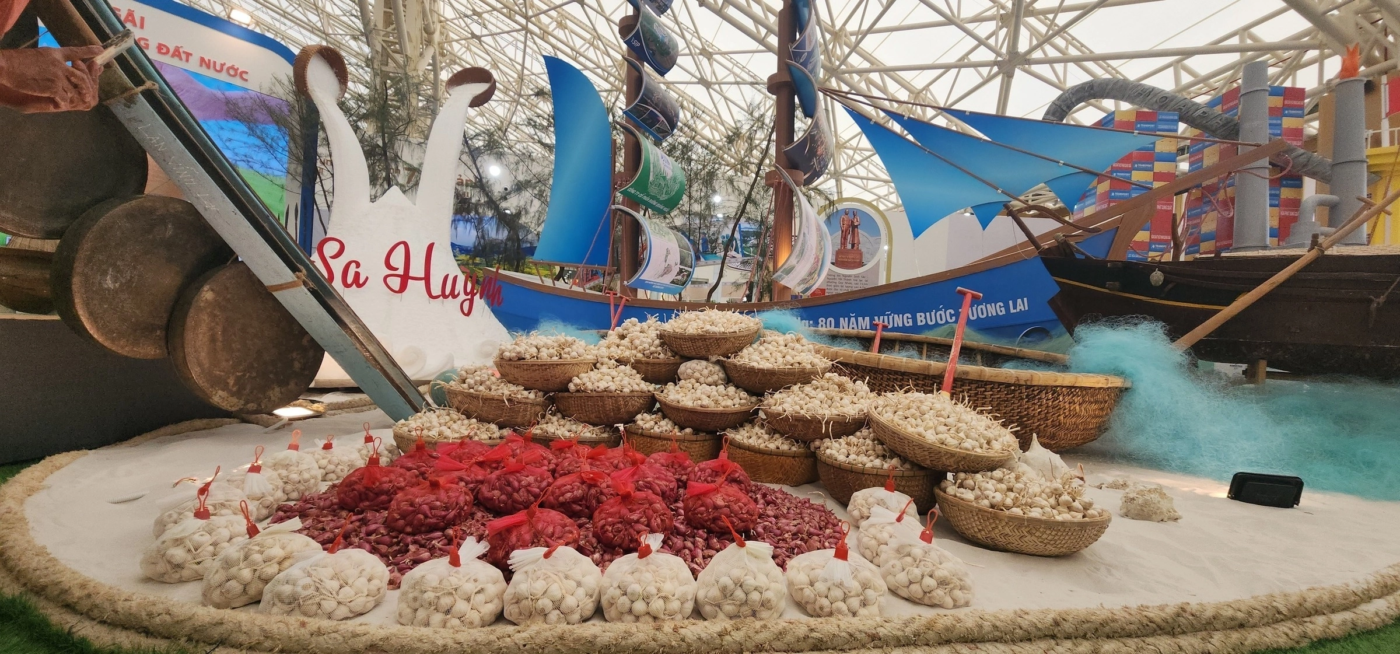 Các sản phẩm tỏi Lý Sơn được trưng bày tại hội chợ thương mại. Ảnh: NVCC